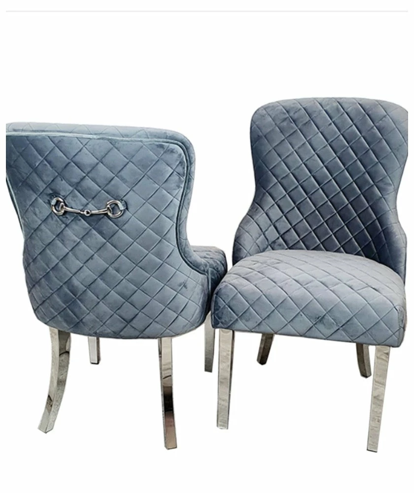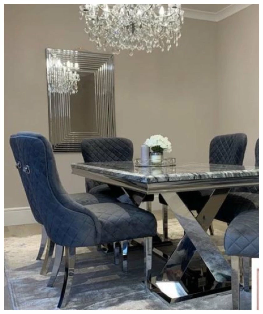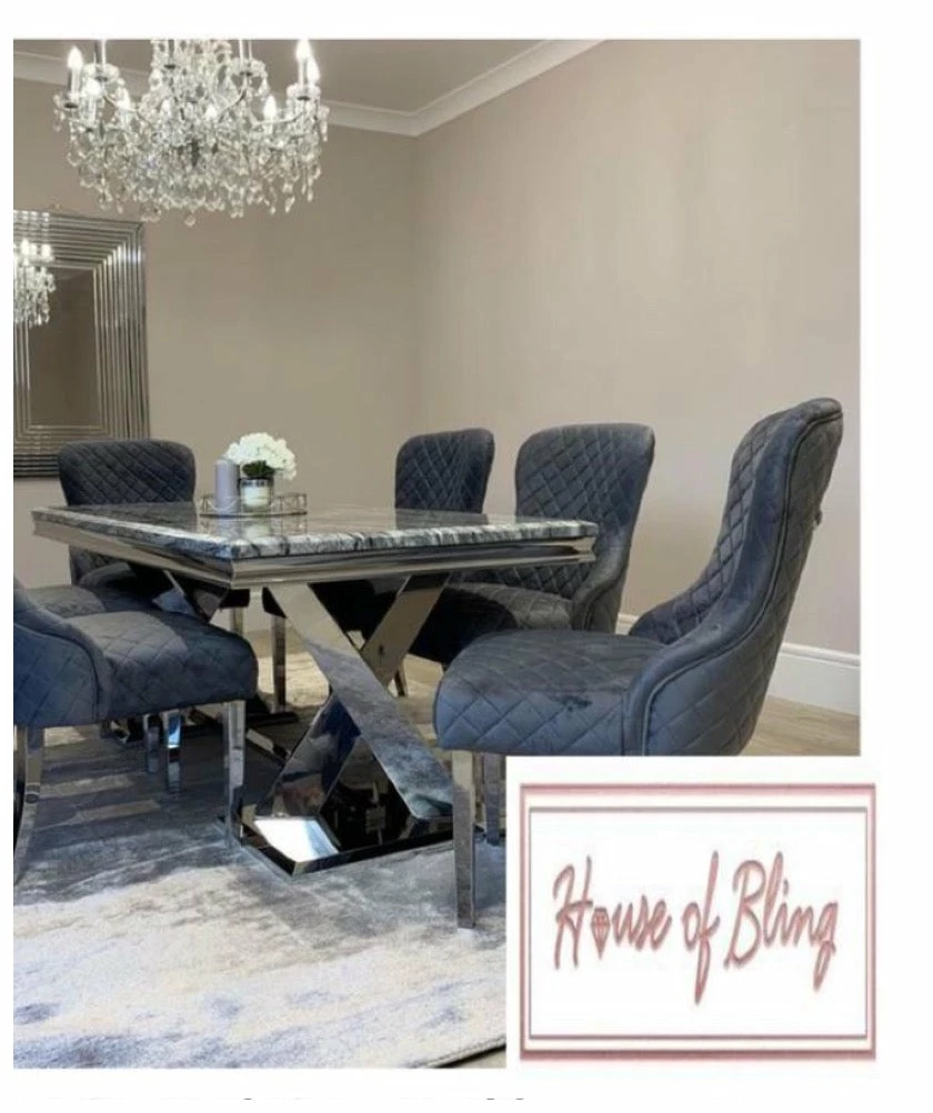 1.8 grey marble top table complete with grey velvet buckle chairs