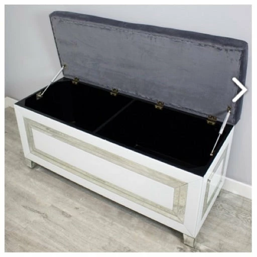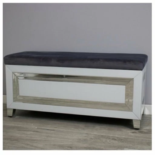 Sleek. modern ottoman. Well suited to the living room and bedroom. Features glossy white glass sides with silver mirror details and feet. The top has a soft and comfortable (faux) suede cushioned seat in stylish dark grey.