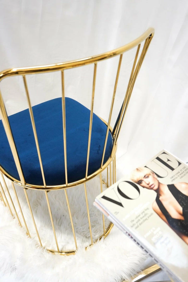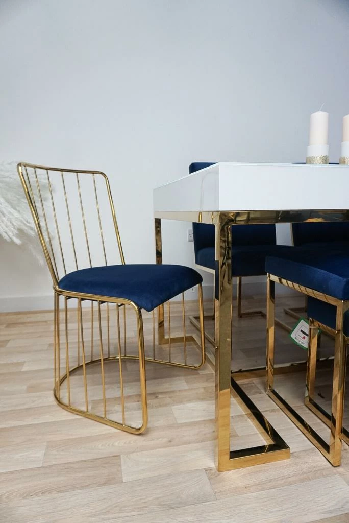 A pair of DOHA blue and gold wired dining chairs with fabric cushioned seat available in the following options: