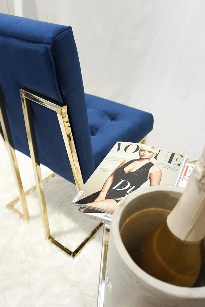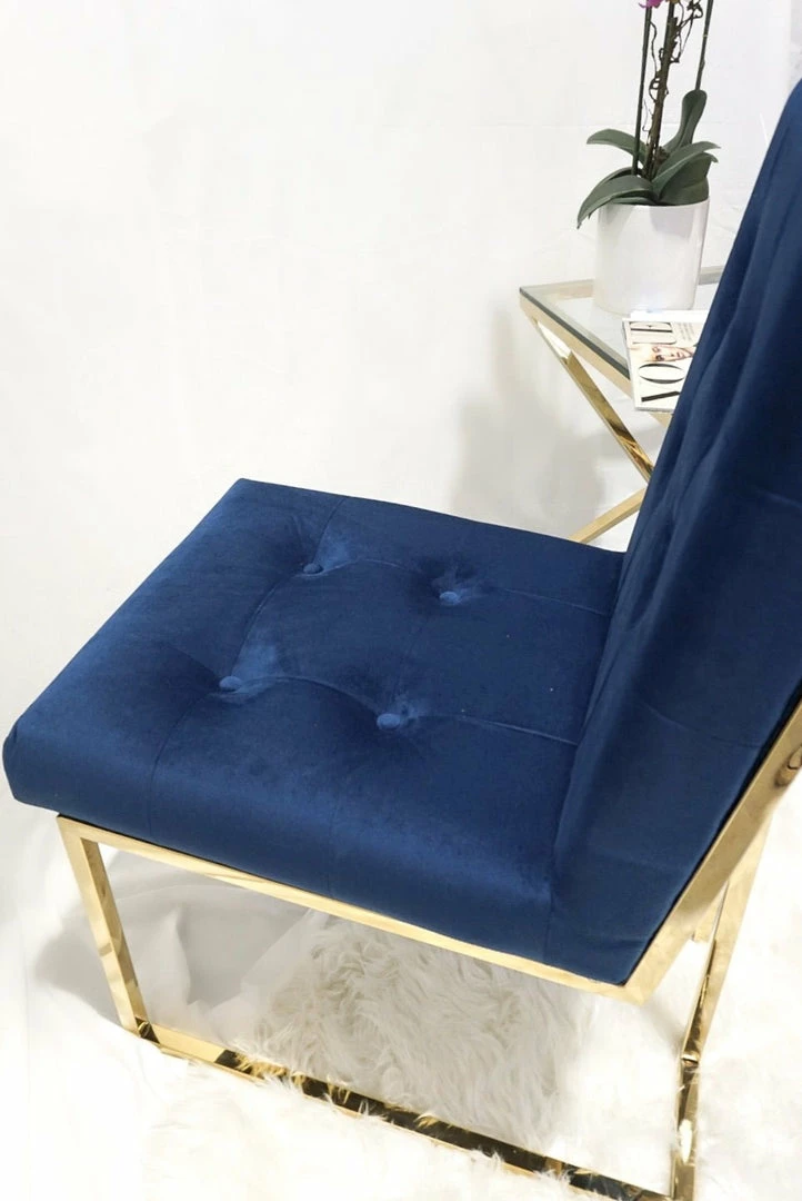 Blue and Gold modern Doha collection luxury dining chair with gold polished iron legs.