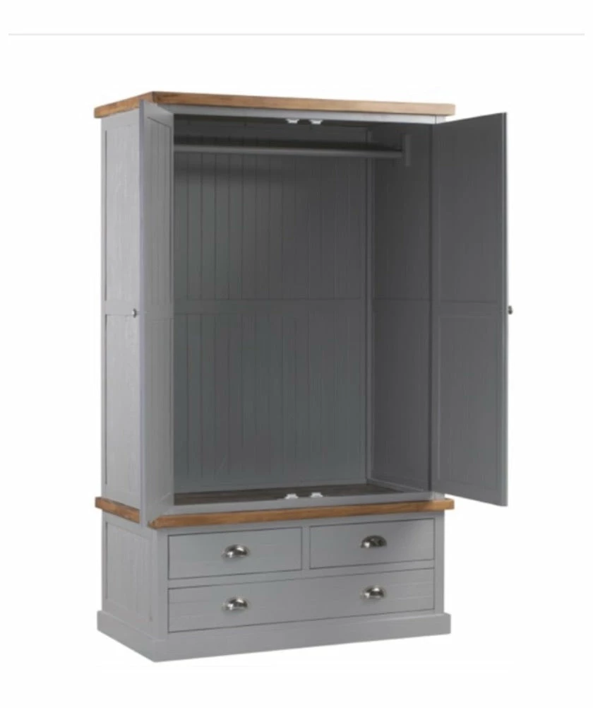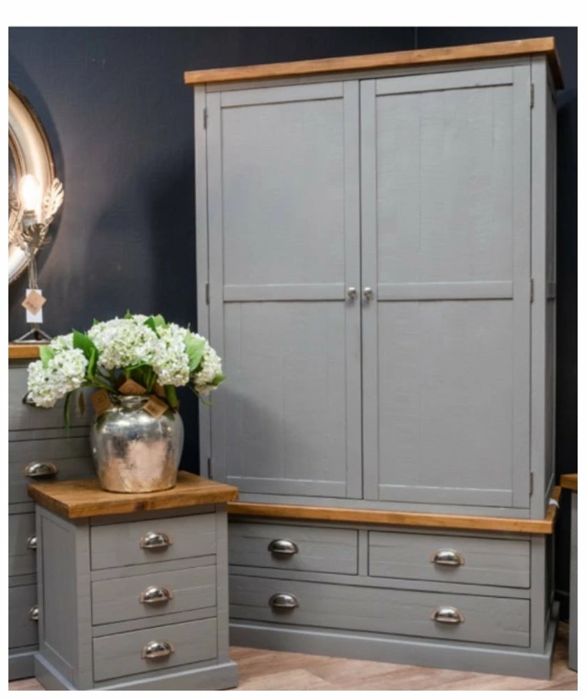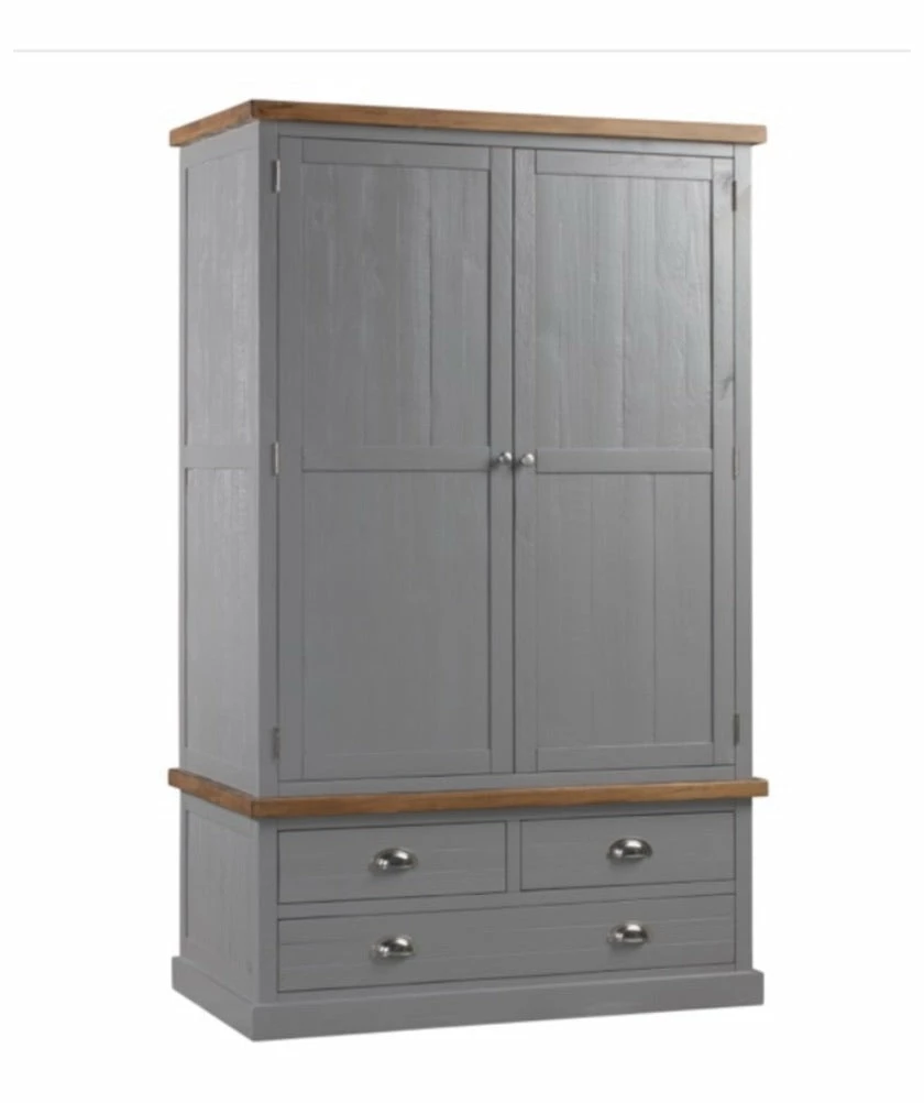 Three Drawer Two Door Wardrobe, a must have item for any bedroom providing storage and space in a stylish way. Finished in a warm grey hue that has been lightly painted allowing for the wood grain to be seen beneath, along with natural pine features and silver handles to create a look that is both easy to accessorised and timeless in style.