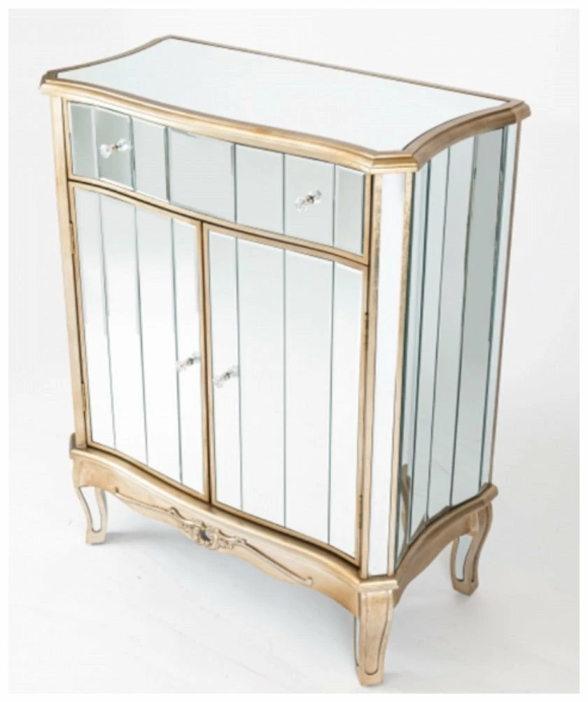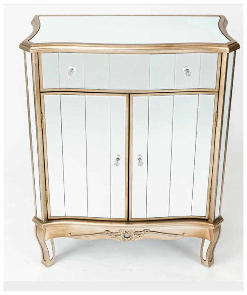 Annabelle French Vintage Distressed Shabby Chic Silver Gilt Leaf Mirrored Cabinet with Cupboard and Single Drawer