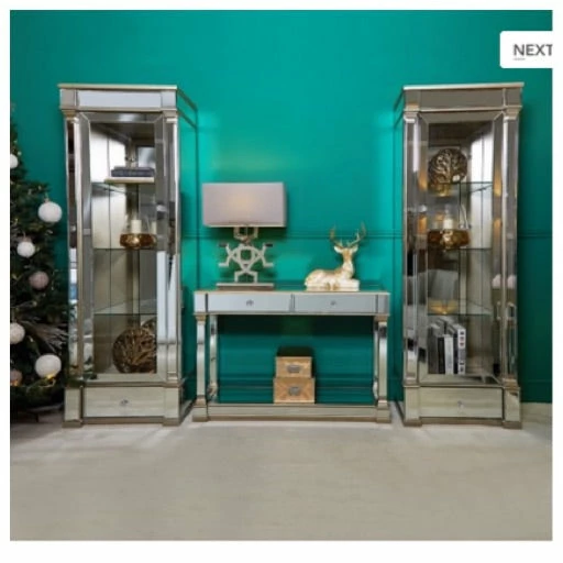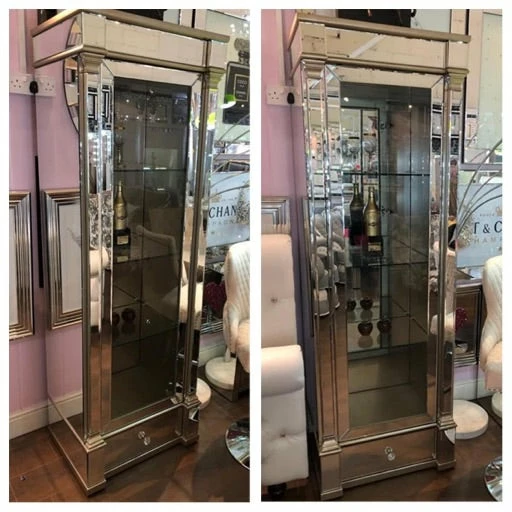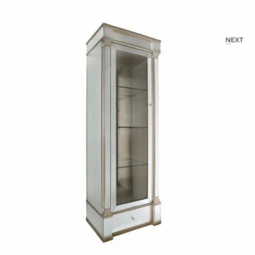 Venice mirrored left door 1 drawer 4 shelf display cabinet with champagne trim