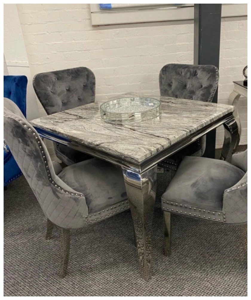 1 meter squared grey marble tables with 4 lion knock dove grey chairs