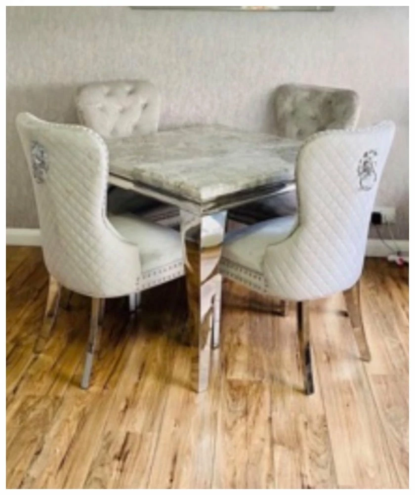 1 meter squared grey marble tables with 4 lion knock dove grey chairs