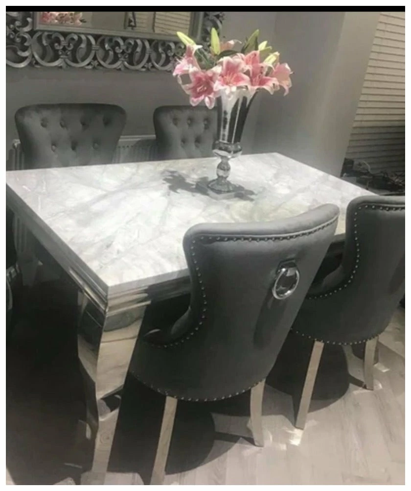 light grey 1.4 marble top with 4 Lara knock grey chairs