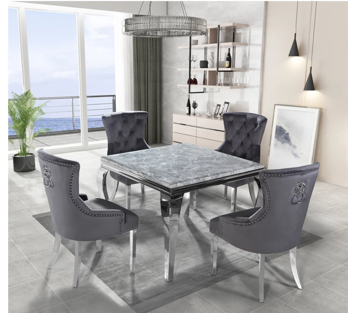 1 meter squared grey marble dining table complete with 4 Lara knock grey chairs
