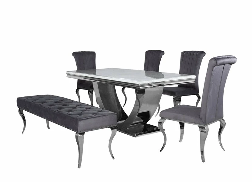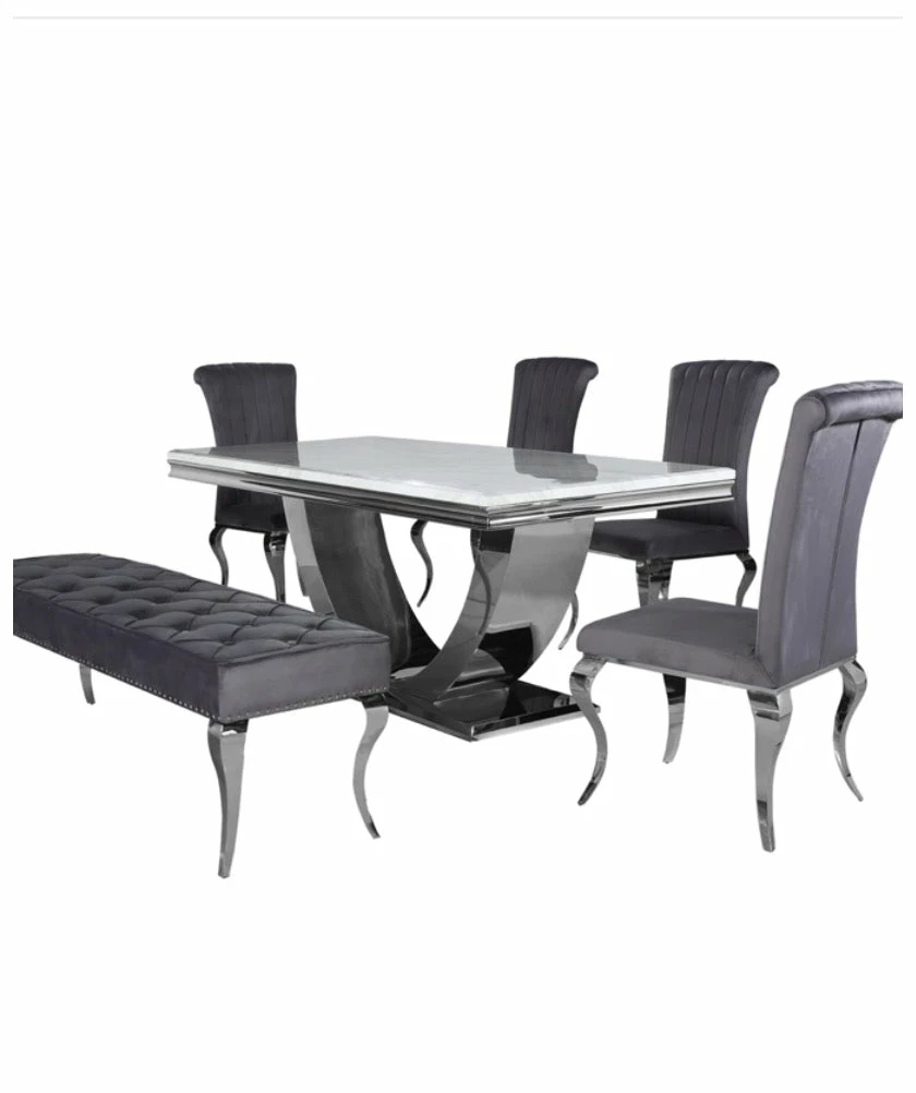 2 meters smoked white marble table complete with grey velvet paris chairs