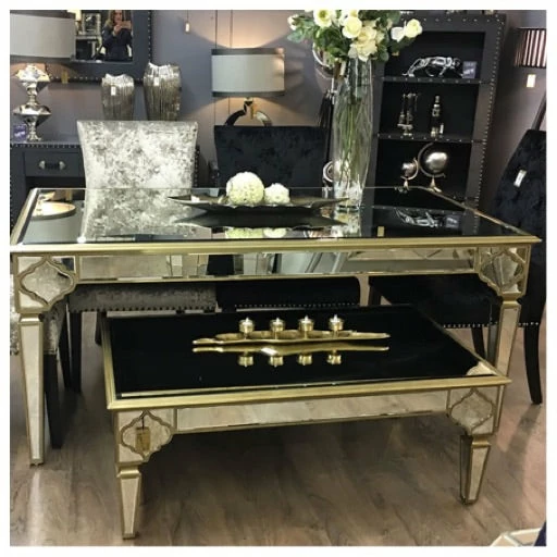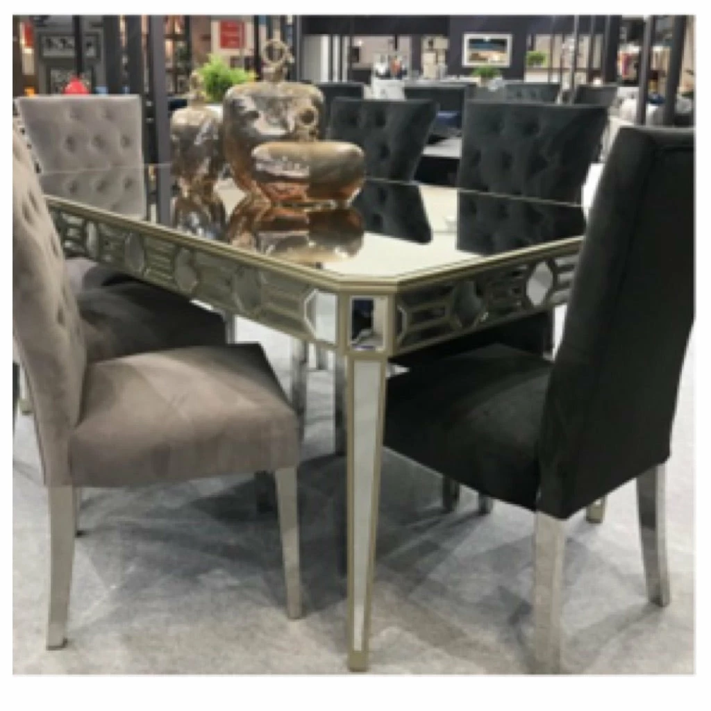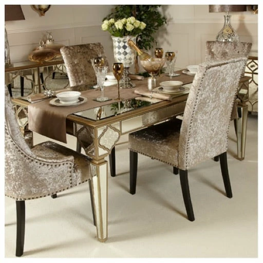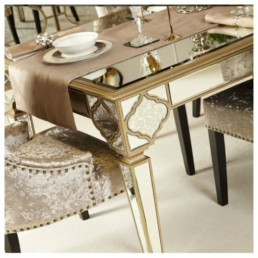 Premium Morocco mirror dining table featuring a striking quatrefoil design trimmed in antique gold, mirrored panels and sturdy mirrored pillar legs.