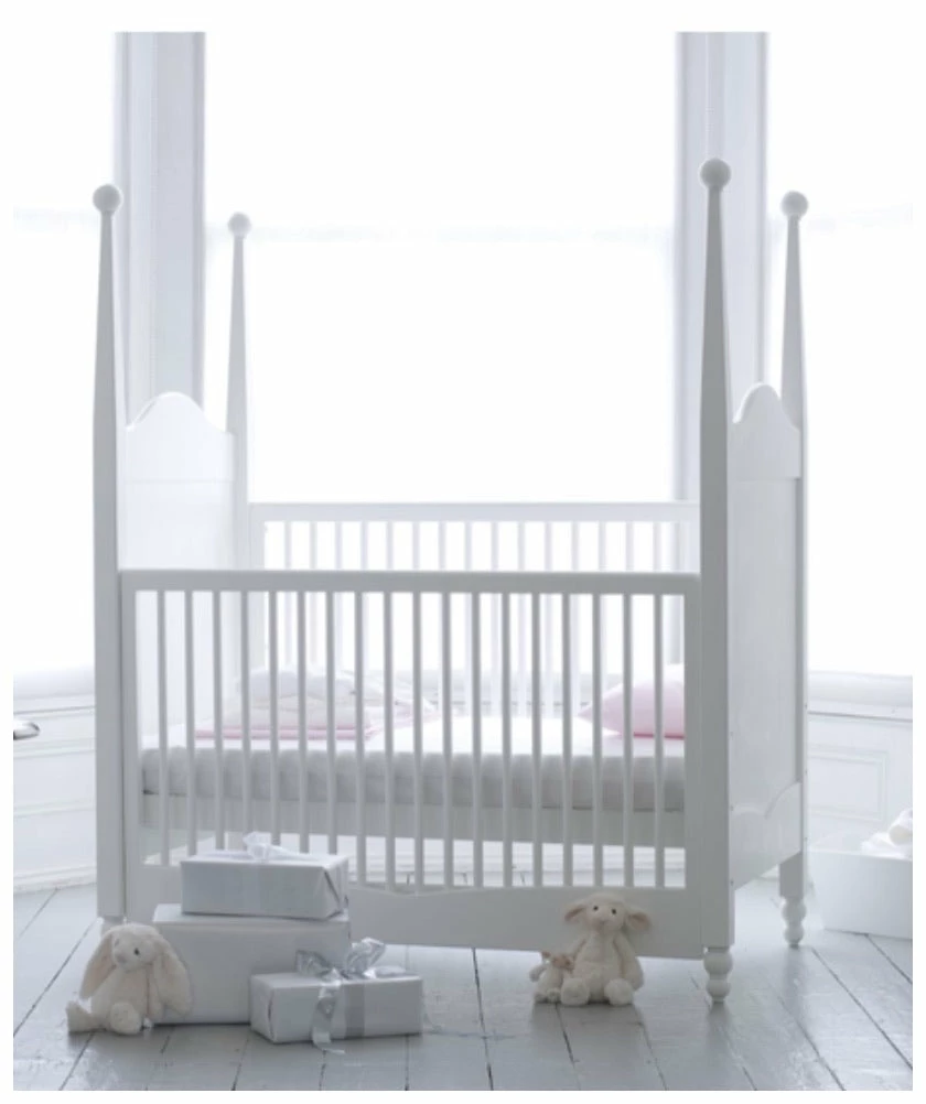 Meticulously hand-crafted from solid wood and laminated birch and finished in a durable child-safe white lacquer, the Hestia four-poster cot bed can be transformed from a cot to a toddler bed and then to a day-bed. With beautifully shaped feet and elegant turned spheres adorning each tapered post, the Hestia Cot lends a sense of regal elegance to your child’s nursery.