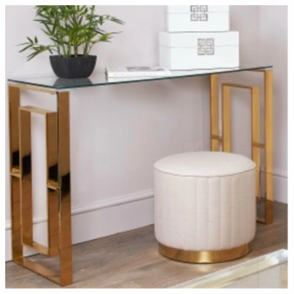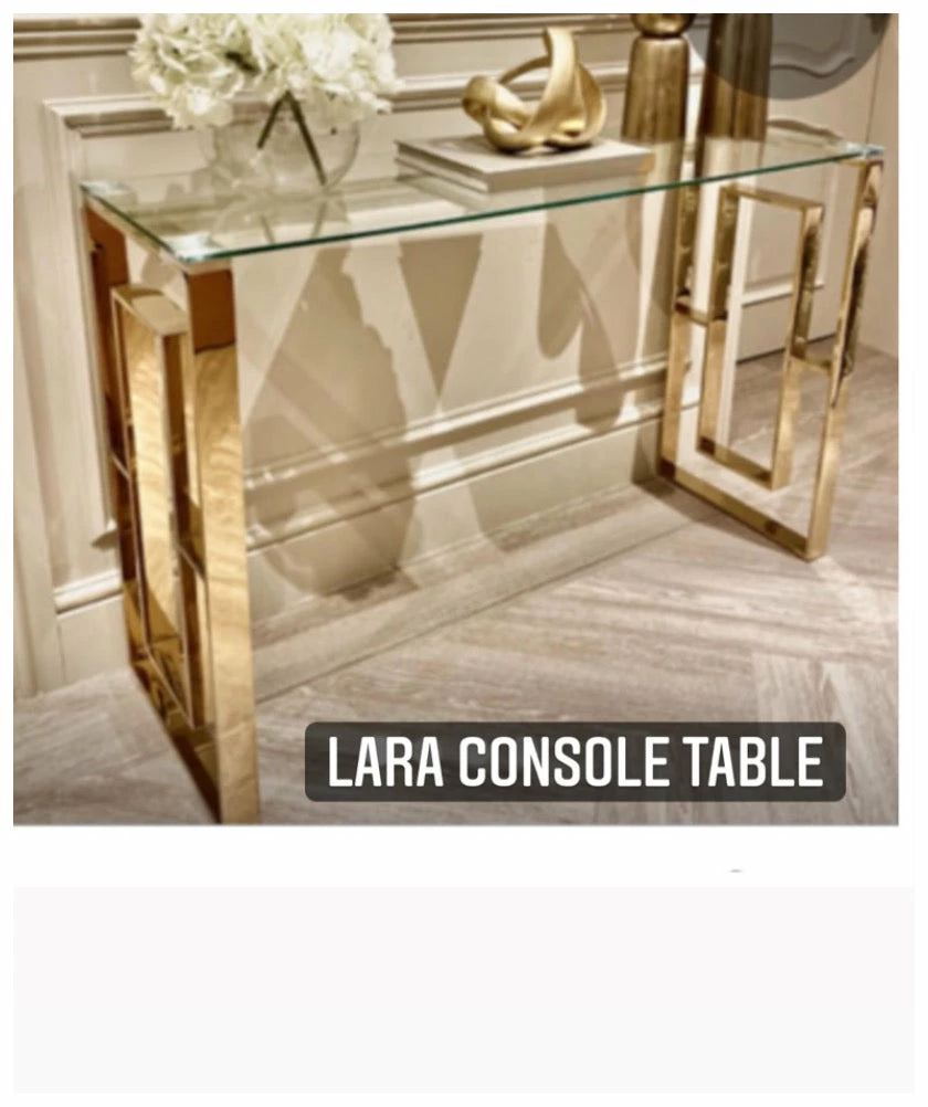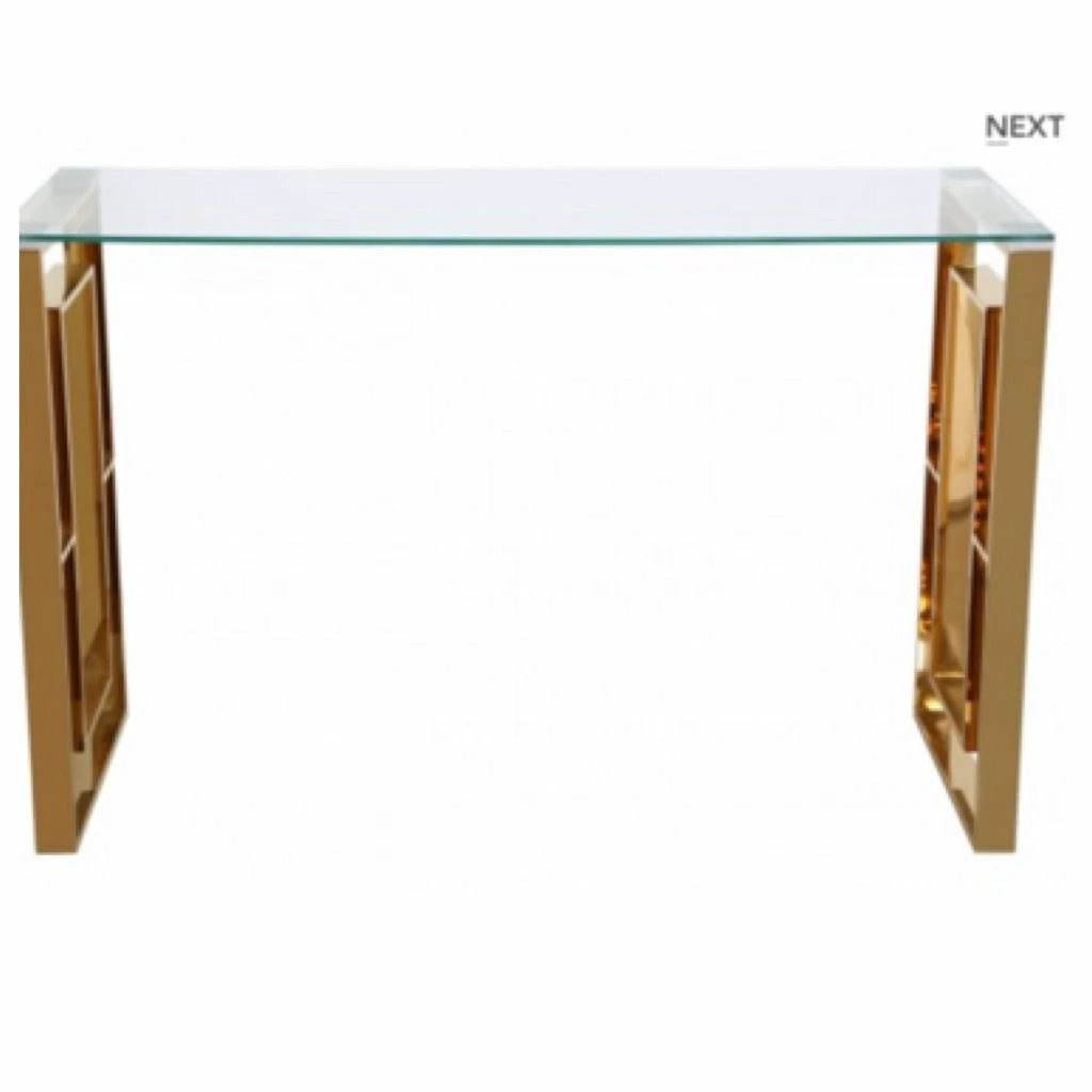 LaragoldApex gold metal console table featuring a steel frame with a golden tint and tempered clear glass table top.