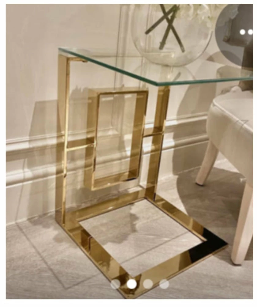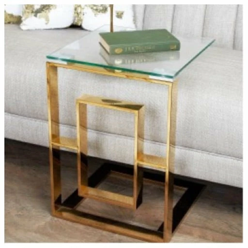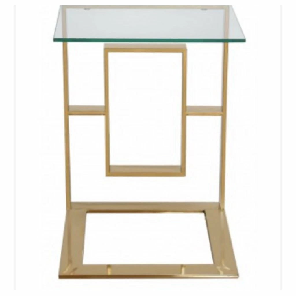 Lara Apex gold metal end table featuring gold tinted stainless steel legs and a clear glass table top