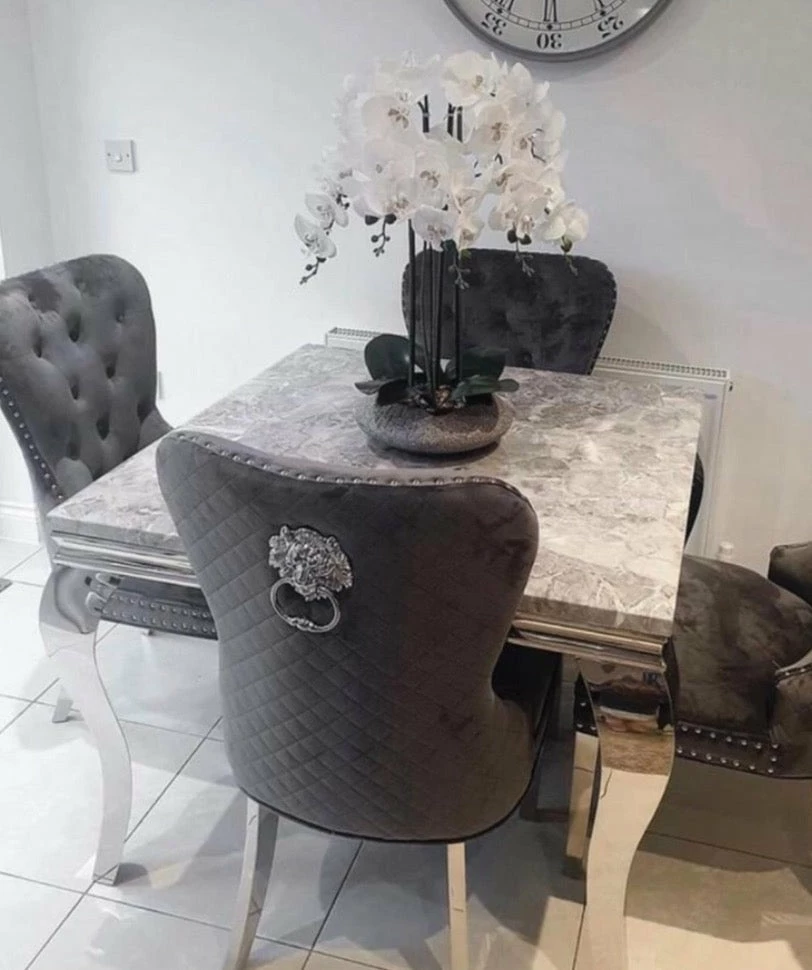 House Of Bling Furniture Boutique Light Grey Marble Devon Table With Dark Grey Lion Knocker Chairs