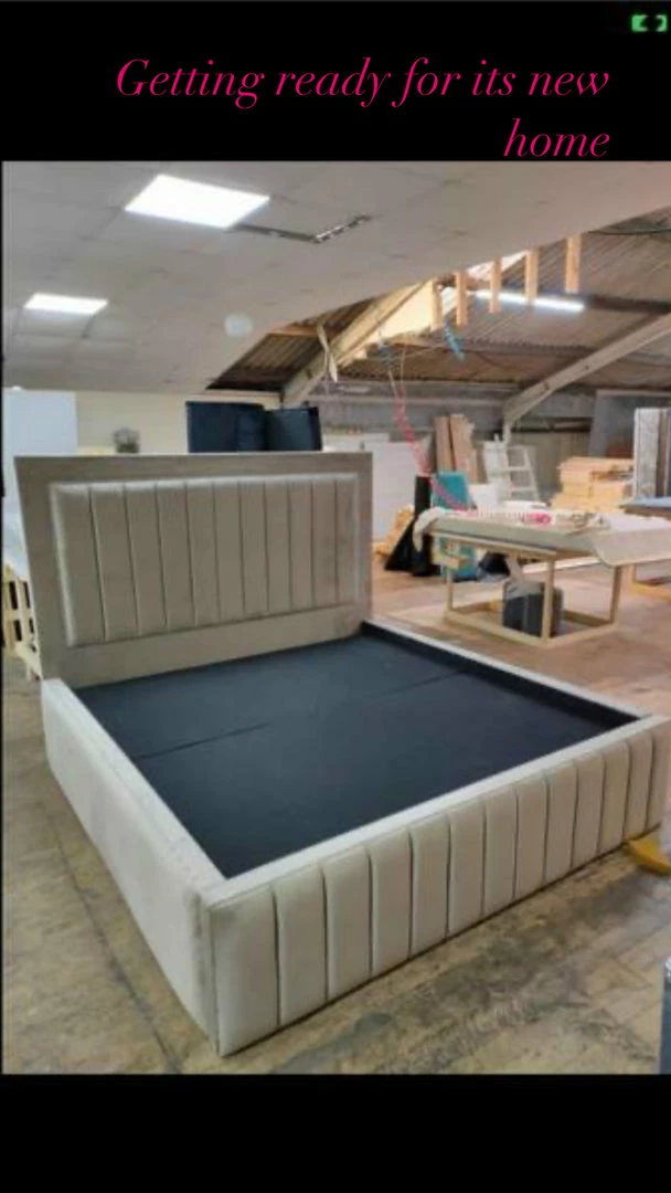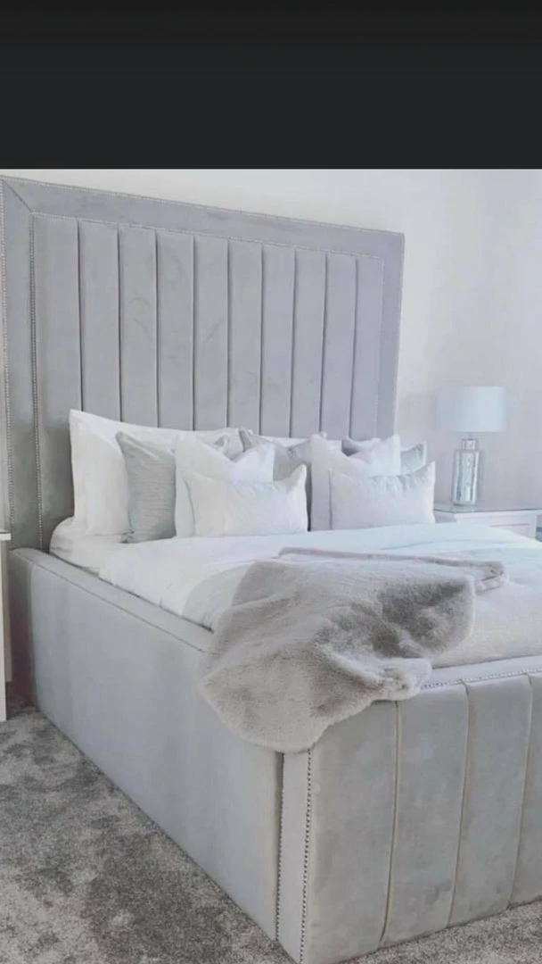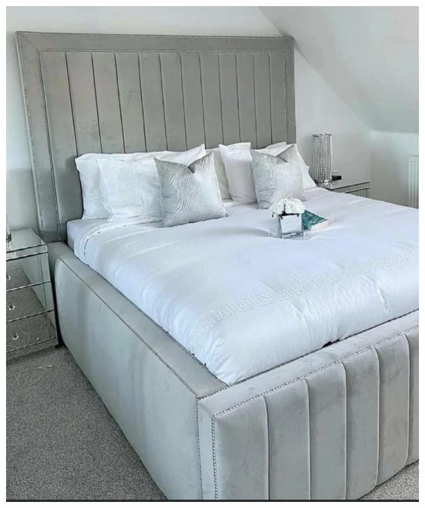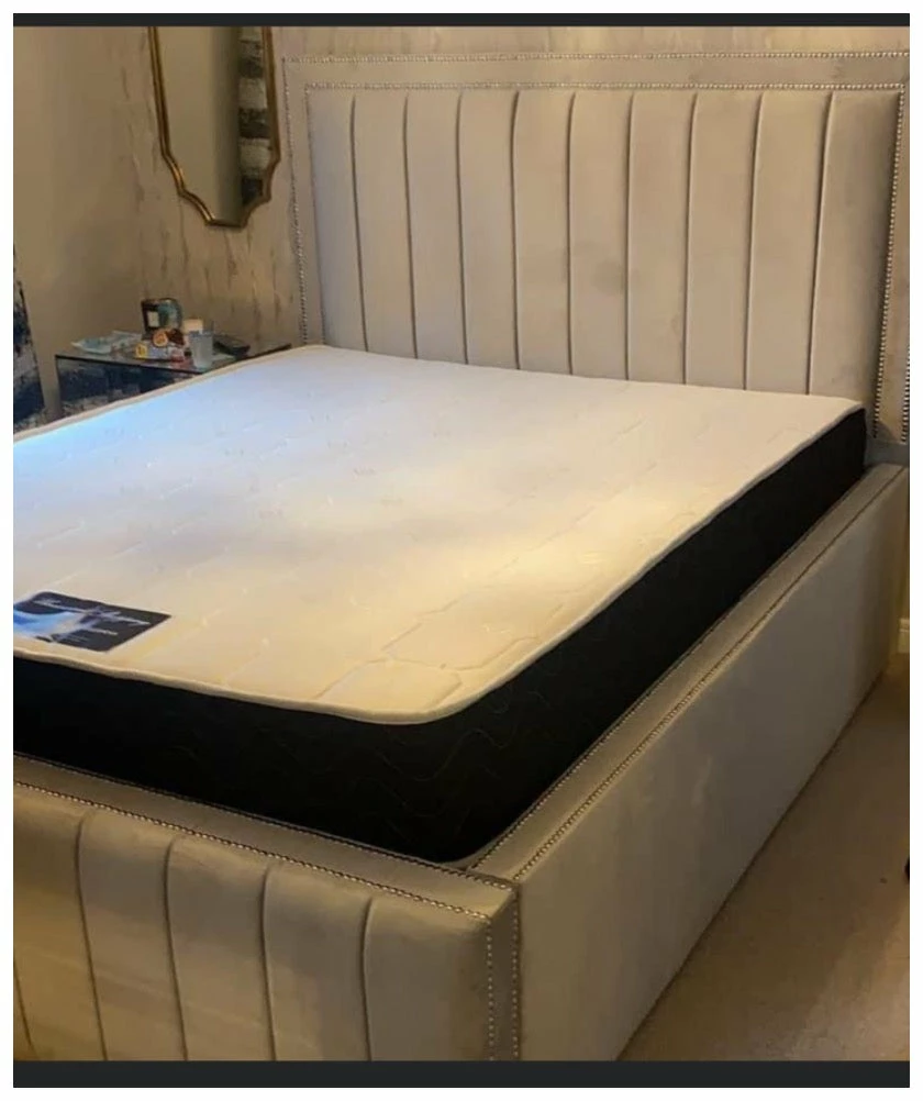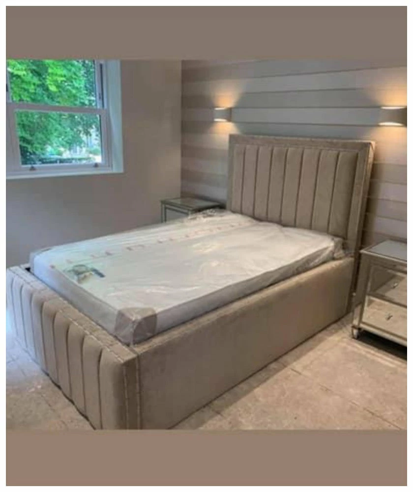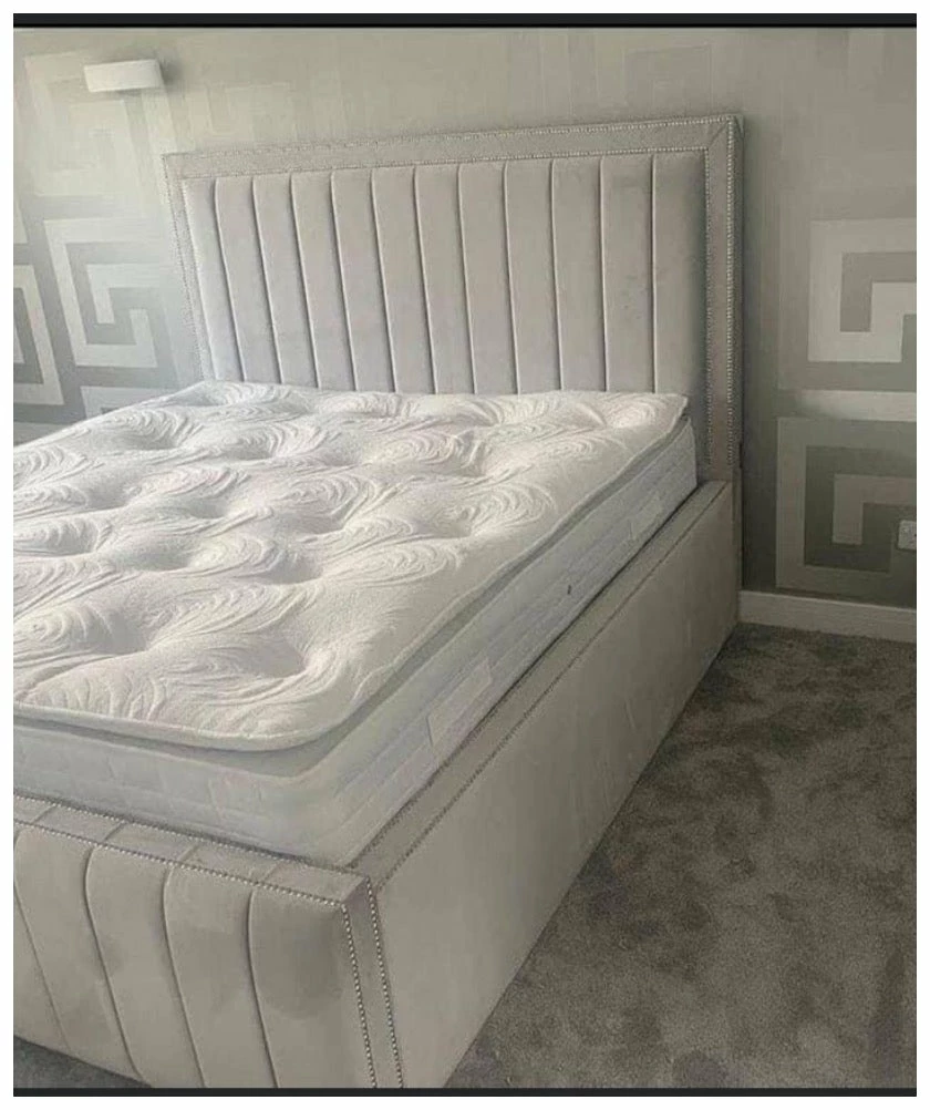 Stunning linear upholstery bed with studding border around side rails aswell as the headboard and footboard comes complete with beading however this can be removed snd be plain