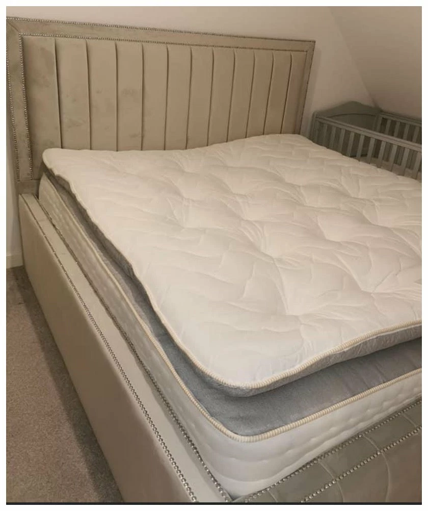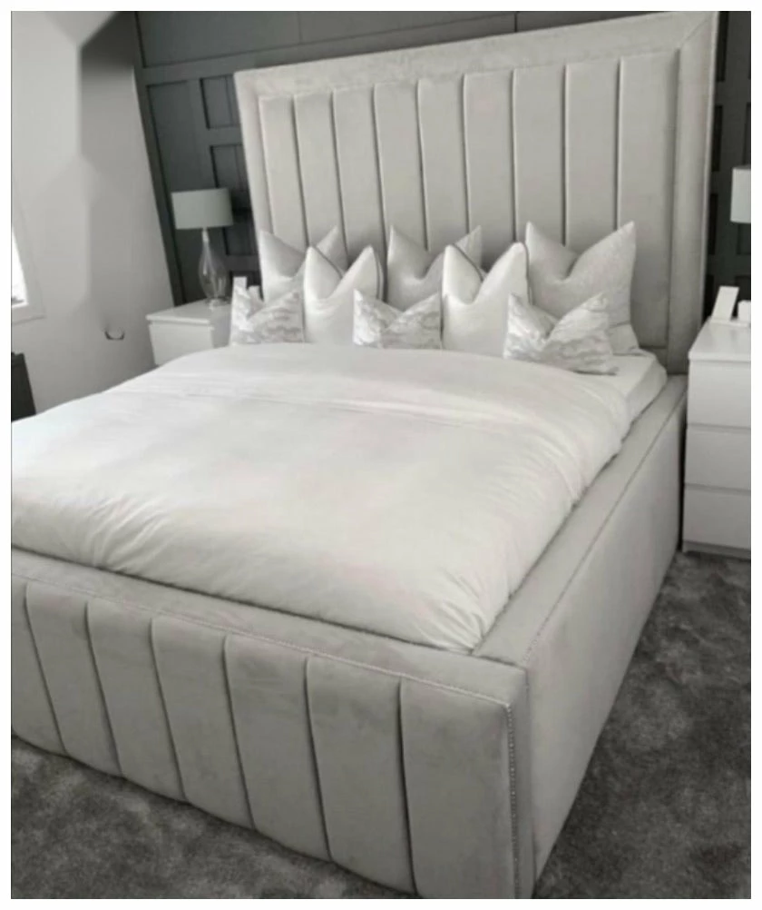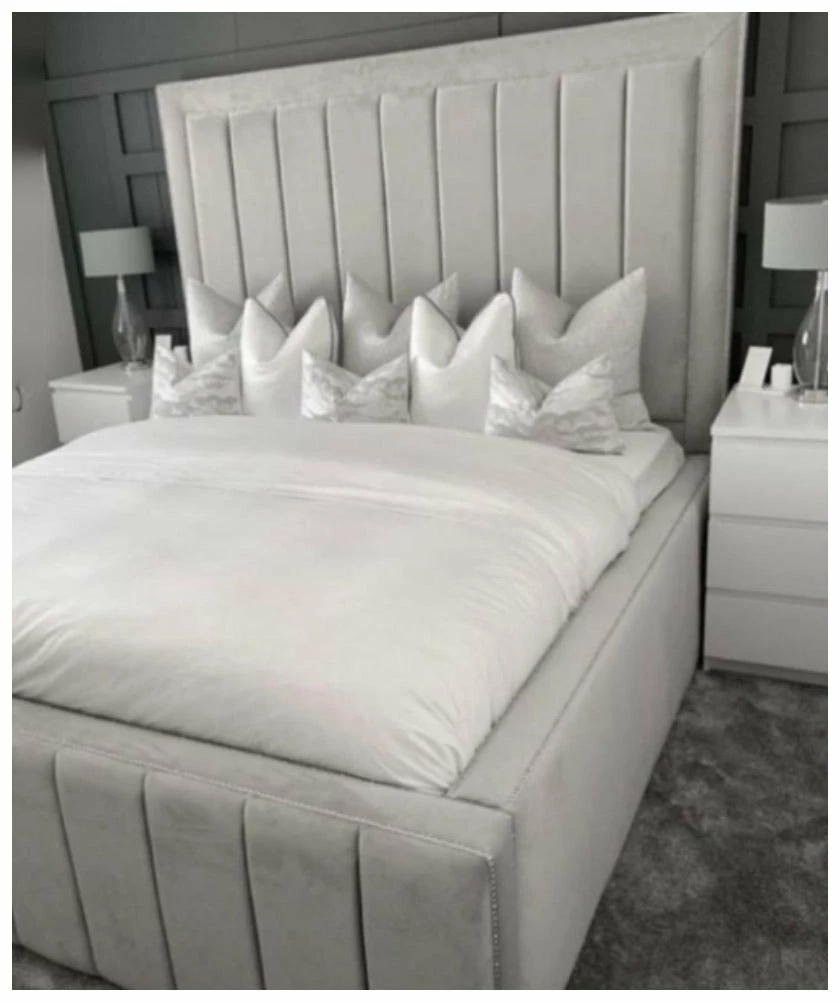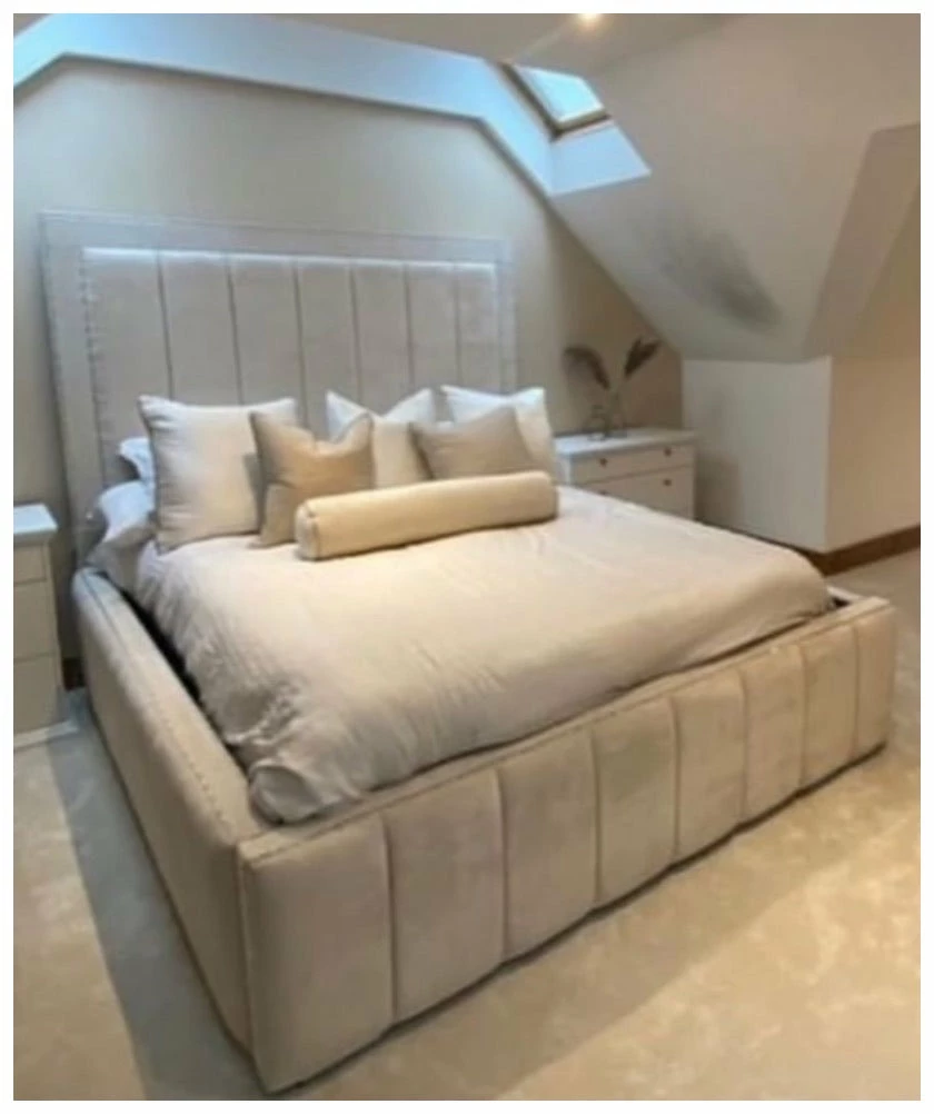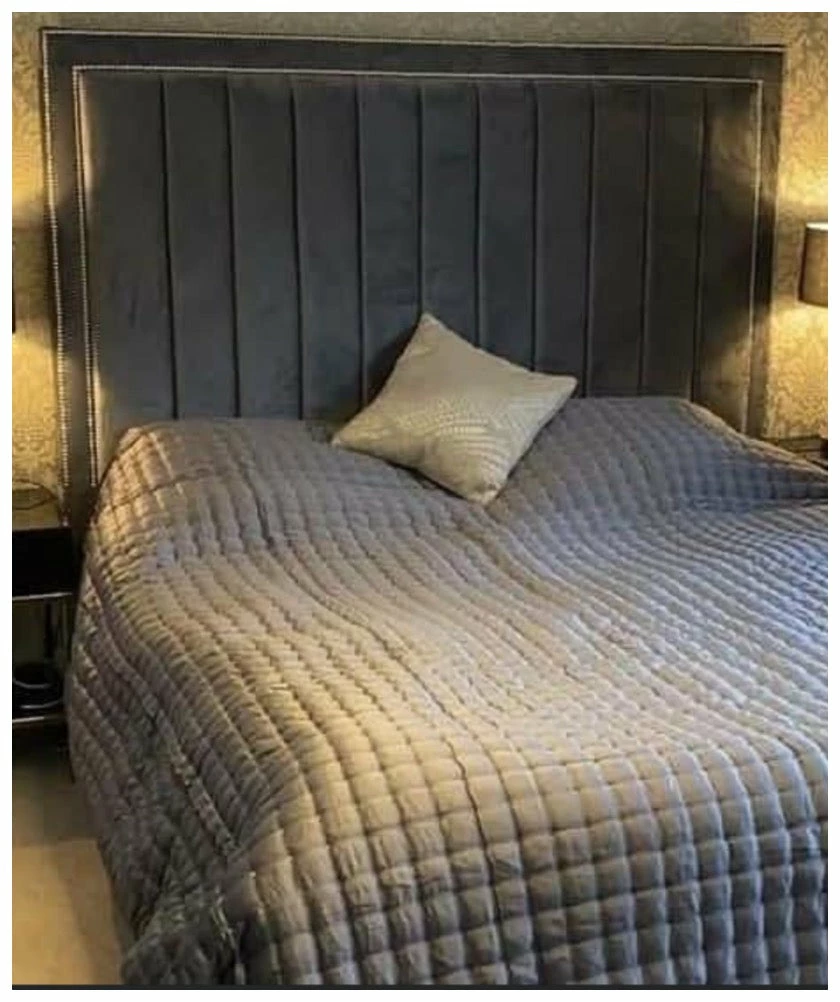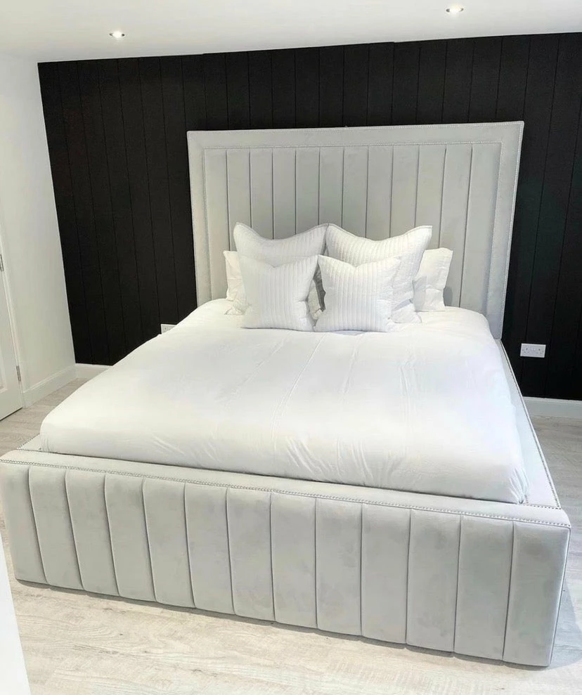 Stunning linear upholstery bed with studding border around side rails aswell as the headboard and footboard comes complete with beading however this can be removed snd be plain