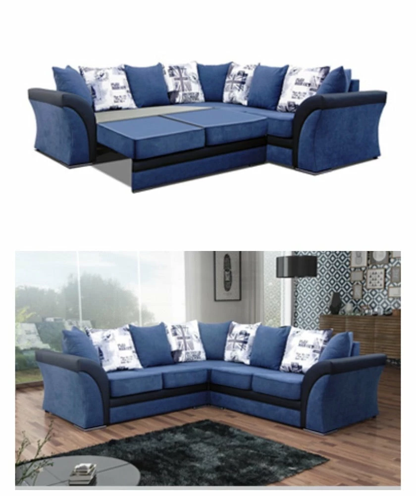 Perfect for those looking for a cozy, comfortable and very functional corner sofa to enhance their living room. Beautifully upholstered in a thick and durable soft touch fabric around richly padded foam seat cushions on top of corrugated springs which helps the sofa to keep its shape without sagging. Paired with matching accented back cushions and chrome feet that help to subtly increase height whilst giving a sleek look. The solid wooden frame will help this piece stand the test of time in any home making this a more of an investment as to a purchase. To top it off the Nasser can be transformed into a full double bed in case you’re expecting visitors or guests who need a place to stay! The 210cm bed length helps taller users to sleep comfortably and thanks to automatic folding facilitators means its an easy process to turn this into a sofa or bed; whichever one you need! Available in two tone blue-dark blue or black-charcoal. This sofa is made to order so delivery times may vary.