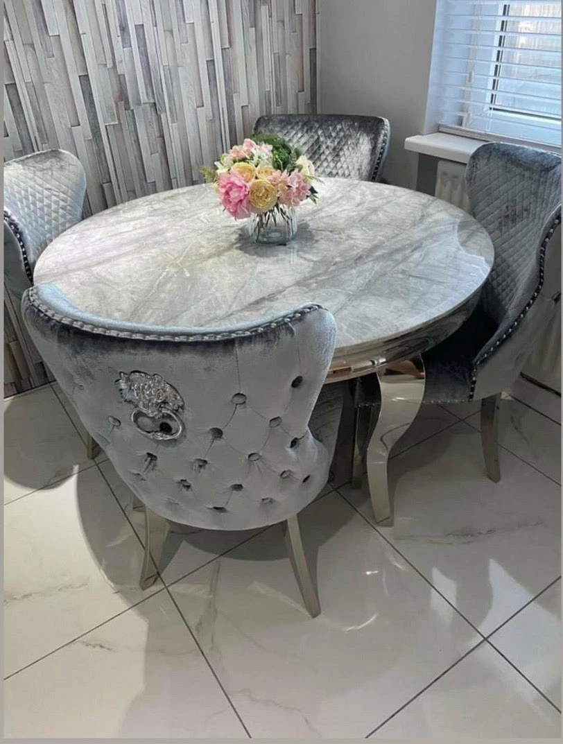1.3 meter marble table in light grey also available in smoked cream marble with 4 grey Valencia chairs