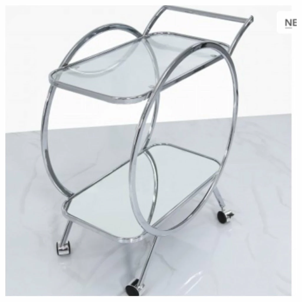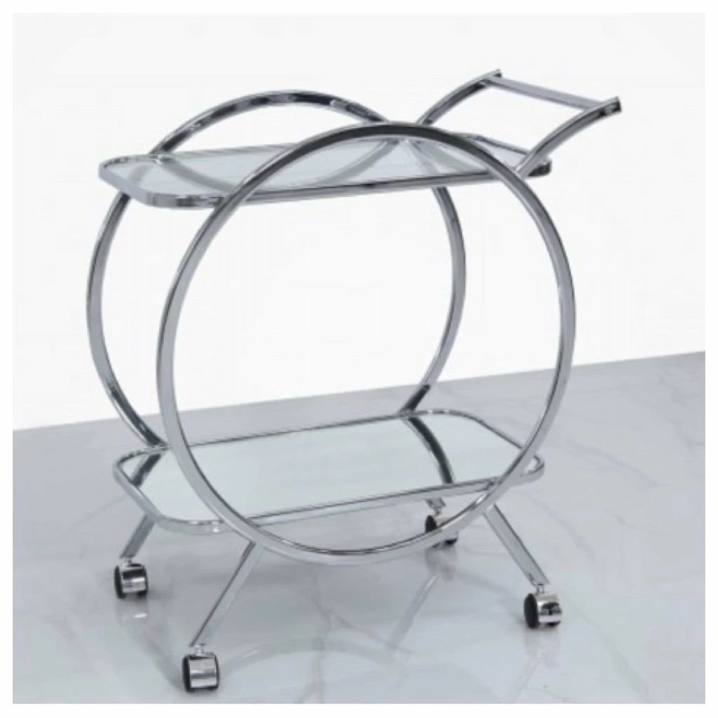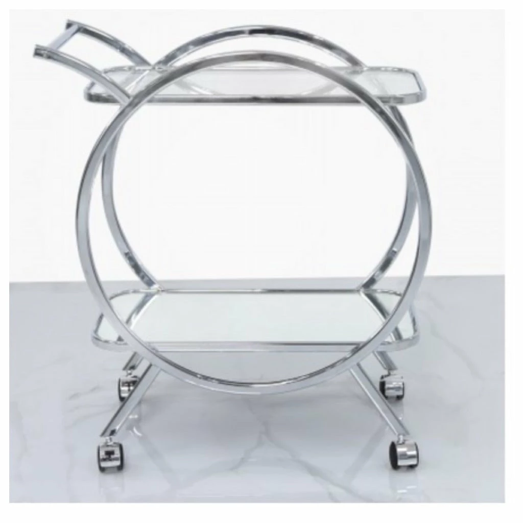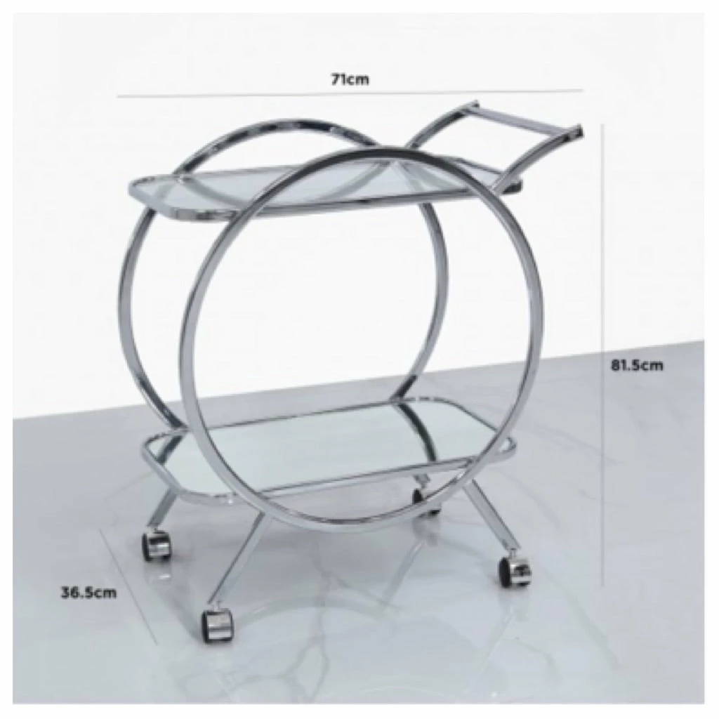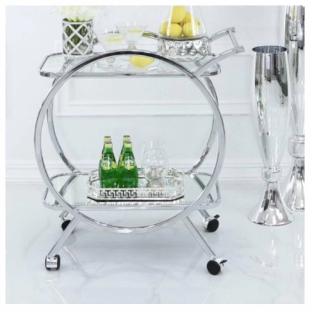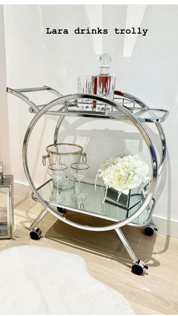 Lara drinks trolley featuring a circular design in chrome with rectangular mirrored shelves. Wheels at the base for easy manoeuvring and a simple chrome bar handle.