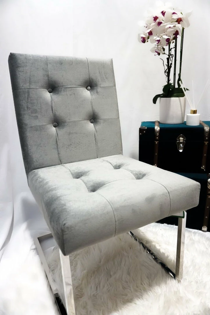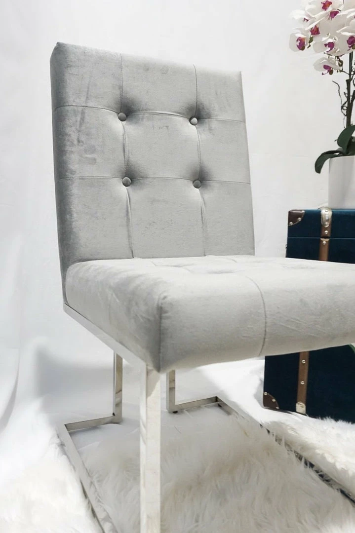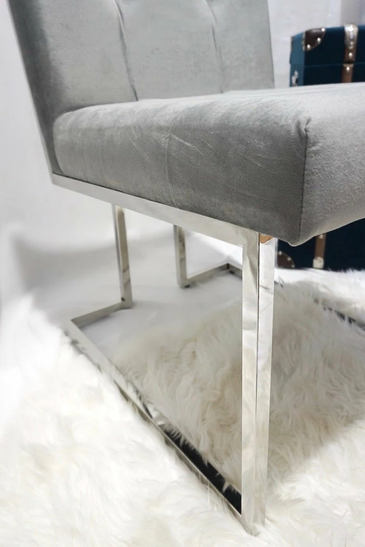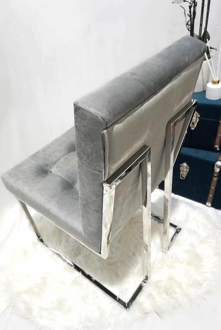Silver and Grey modern Doha collection luxury dining chair with silver polished iron legs.