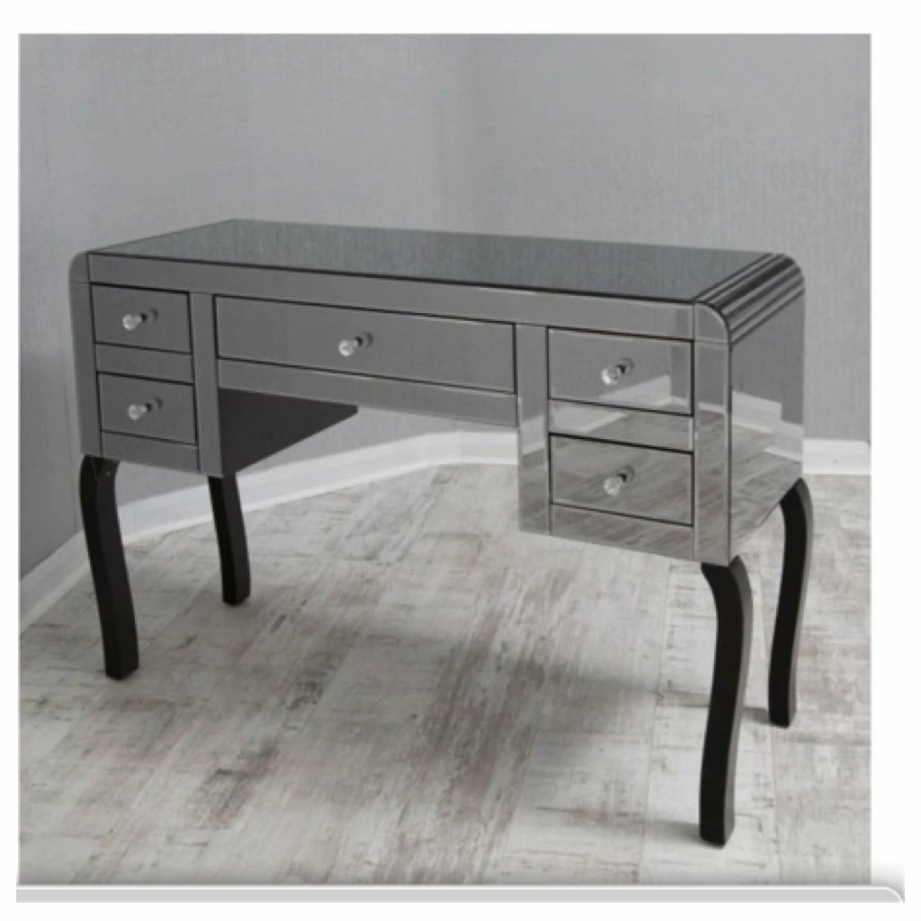 As part of our Smoked Mirrored Furniture this Smoked Mirrored Dressing Table also comes complete with the rounded bevelled curved edges which is part of this range of furniture. This Smoked Mirrored Dressing Table also has great storage space for those essential items having 5 drawers, 2 to either side and one in the middle. Sat on elegant designed black legs this table is stylish and will add character to any bedroom.