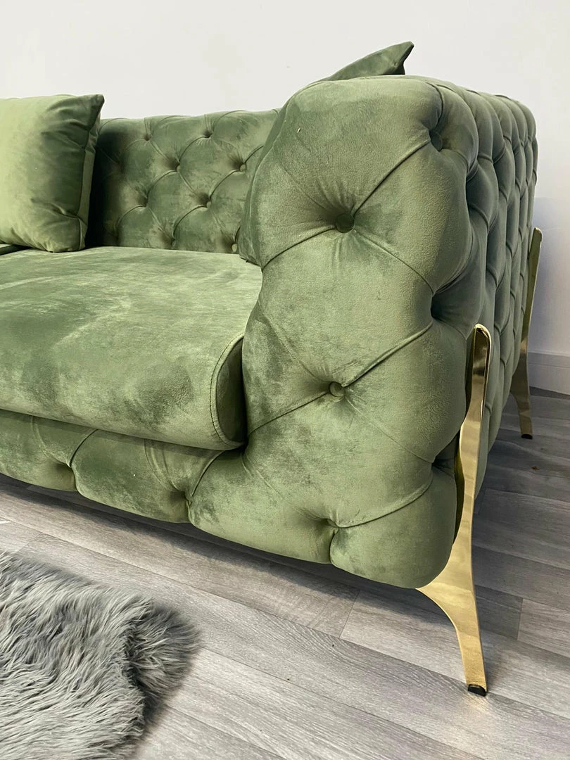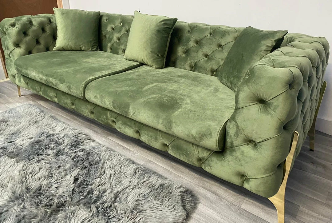 Contemporary deep button tufted velvet chesterfield sofa. New modern sofa. Beautiful deep buttoned tufting in hard wearing non-fade breathable velvet.