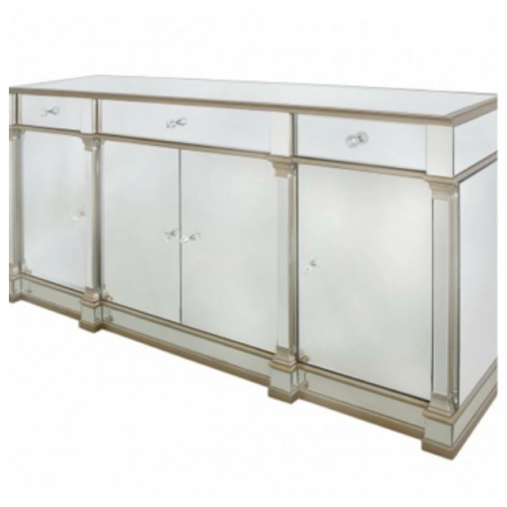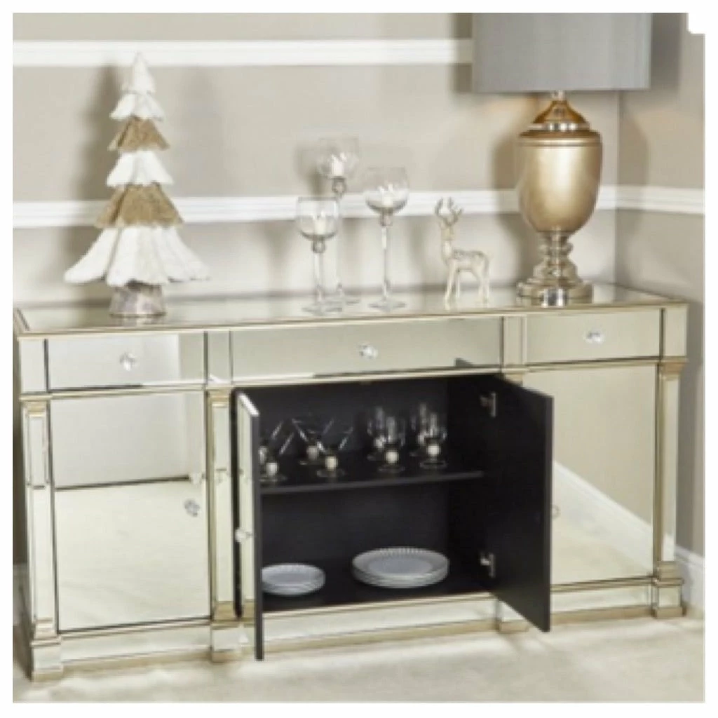 Complete your living or dining area with the truly glamorous Venice sideboard. Featuring a champagne trim, crystal handles, 3 drawers on metal runners and 3 storage cabinets providing plenty of space for all your possessions as well as looking effortlessly stylish in any space.