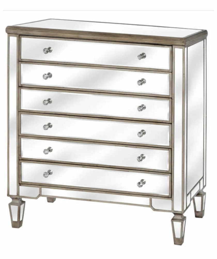 Six Drawer Mirrored Chest, handcrafted to utmost perfection This stunning mirrored piece features champagne detailing adding a timeless luxury into any interior. Six Drawer Mirrored Chest is stunning and a real focal point in any room.