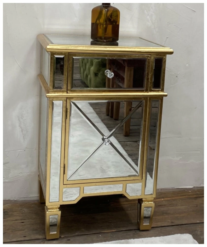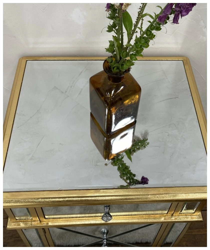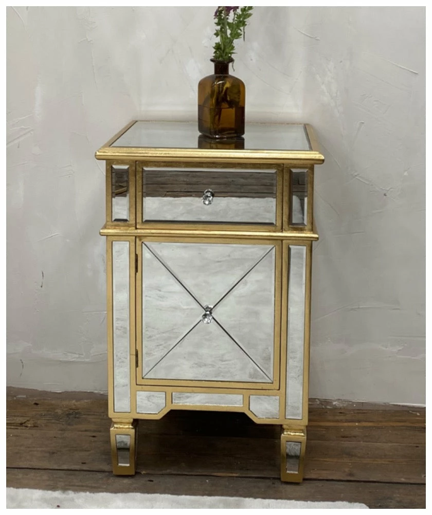 An elegant and beautiful slim mirrored bedside table. The perfect, standard size makes it ideal for most bedrooms, and the handcrafted mirrored glass means this item will look stunning in almost any setting. The finish is in silver gilt which is hand applied leaf. This creates a beautiful iridescent patina with a distressed finish. The silver leaf is hand finish therefore is it natural to expect and appreciate slight imperfections as a feature of this furniture.