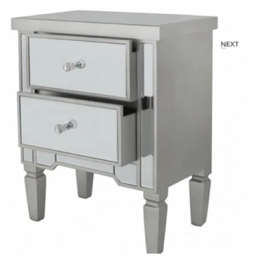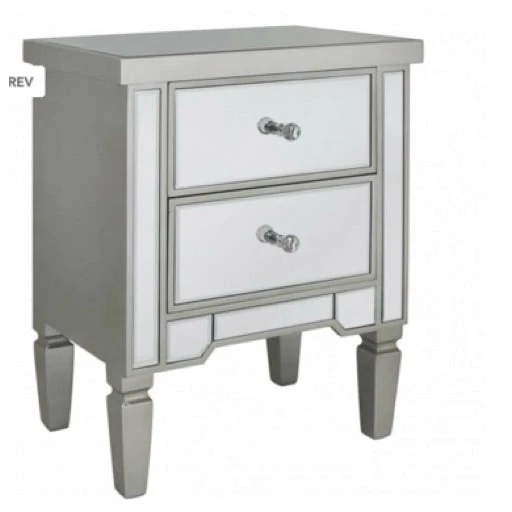 champagne wood bedside cabinet with x2 drawers, finished with a mirrored top and crystal handles.