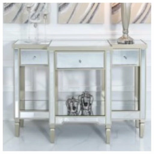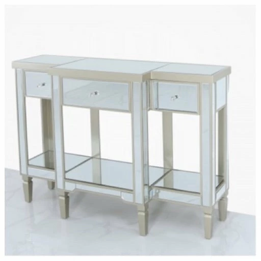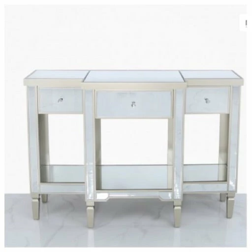 3 drawer console table features a fully mirrored tabletop and panelling throughout, 3 drawers with crystal handles, a lower shelf and elegant dark champagne painted trims and legs