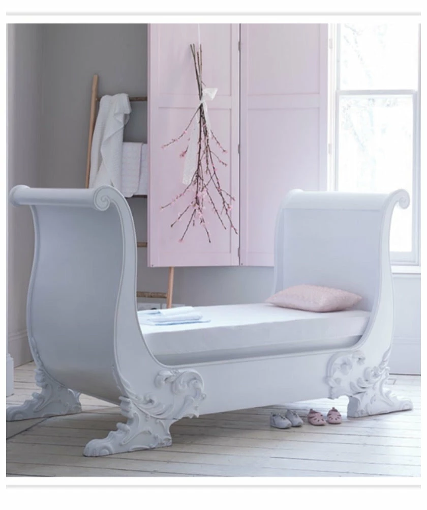 With its beautiful curves and magnificent wave of wood rising sitting proudly on its hand carved oak feet, the Windsor sleigh cot is a stunning addition to any nursery. Handcrafted from hardwood, it is built to last. With its adjustable mattress positions, it is suitable from birth it then becomes a toddler bed and, ultimately, an elegant sofa bed. The Windsor cot is finished in a childsafe lacquer that enhances the majestic curves of the design and the unique grain and natural colour of the wood. Beautiful and functional, the Windsor cot is a piece of furniture that will last for many years to come.