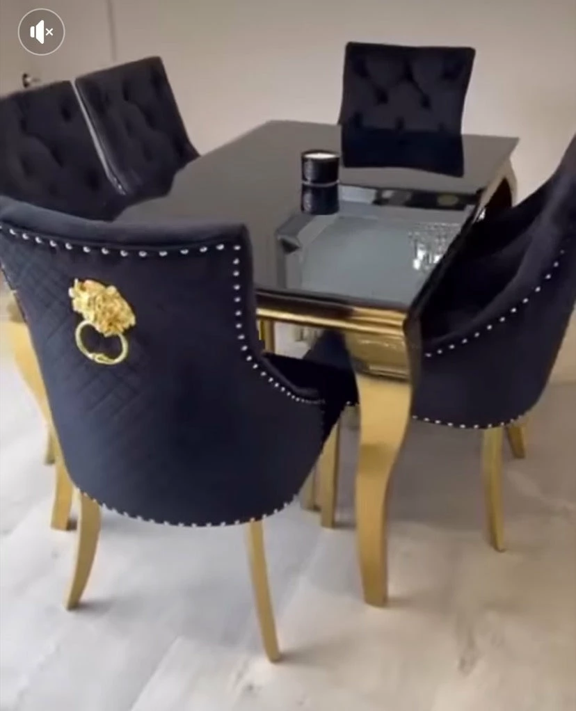1.6 meter x 90 cm meter black glass table with beautiful gold base and matching chairs